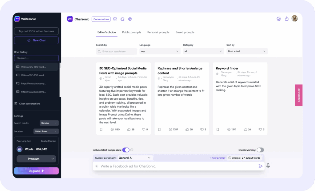 The platform’s analytics dashboard provides detailed insights into prompt performance, helping users understand which approaches yield the best results. This data-driven approach to prompt optimization makes Writesonic particularly valuable for businesses that need to justify their AI investments with measurable results.
