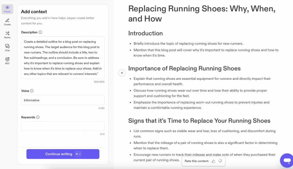Rytr’s template library covers a wide range of content types and use cases, from creative writing to business communications. The platform’s prompt suggestions are contextually relevant and often require minimal editing, making it efficient for users who need quick results.