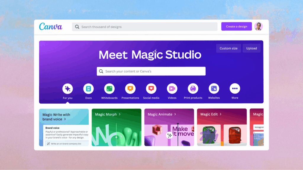Canva has revolutionized visual content creation with its suite of AI-powered design tools. The platform’s AI powered content creation features make it possible for anyone to create professional-looking graphics, videos, and presentations without extensive design experience.