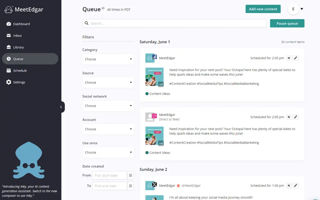 Take Edgar’s AI sidekick, Inky, for example. This innovative AI social media tool represents the next generation of automated social media management, combining content creation with intelligent scheduling and engagement.