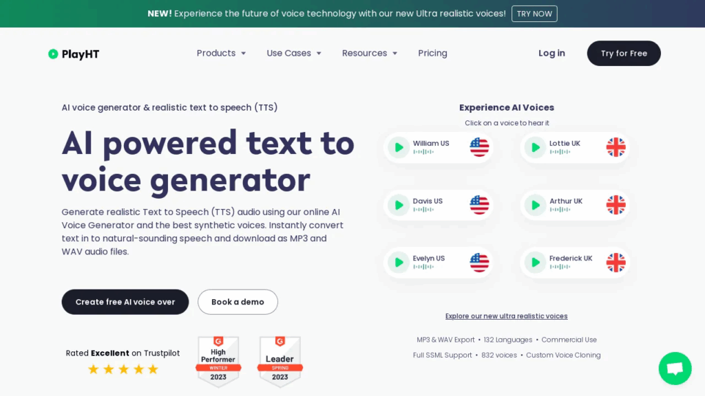Play.ht is a cloud-based AI voice over generator known for its ease of use and wide voice selection. With over 900 AI voices across more than 140 languages, it’s a powerful AI tool for text to speech free trial users and professionals alike.