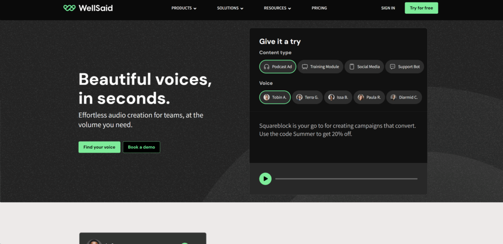 WellSaid Labs is known for studio-quality voice synthesis and is often used in commercial settings where audio clarity and tone are crucial. Their AI voice over engine creates voice styles tailored to different business needs.