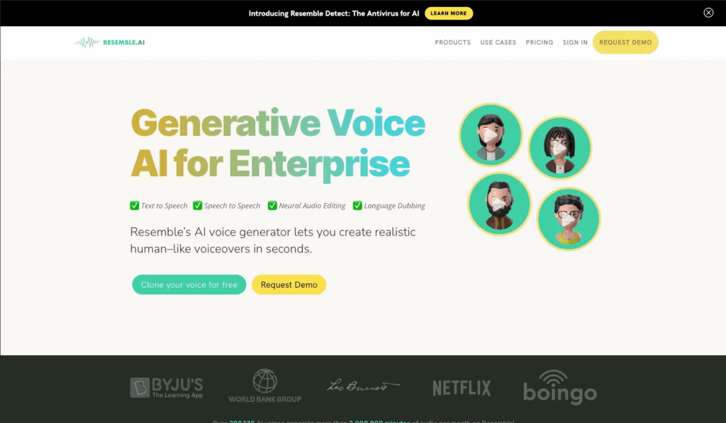 Resemble.ai focuses on customization. This tool lets you create personalized voice avatars using only a few minutes of recorded voice. It’s ideal for developers looking for a voice AI generator they can integrate into applications and platforms.