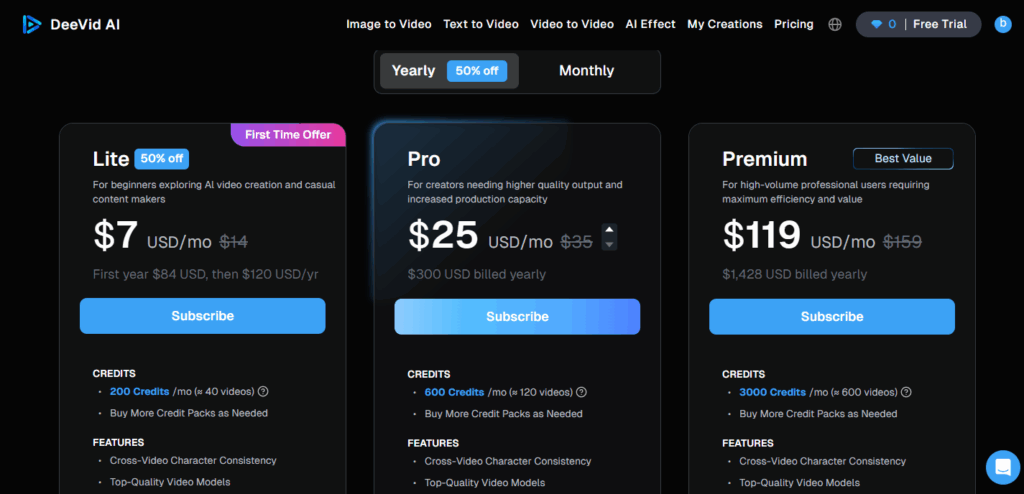 Deevid AI operates on a freemium model with paid plans starting at $14 per month, offering a 29% discount for annual subscriptions. This pricing structure makes the platform accessible to individual creators while providing scalable options for businesses and agencies.